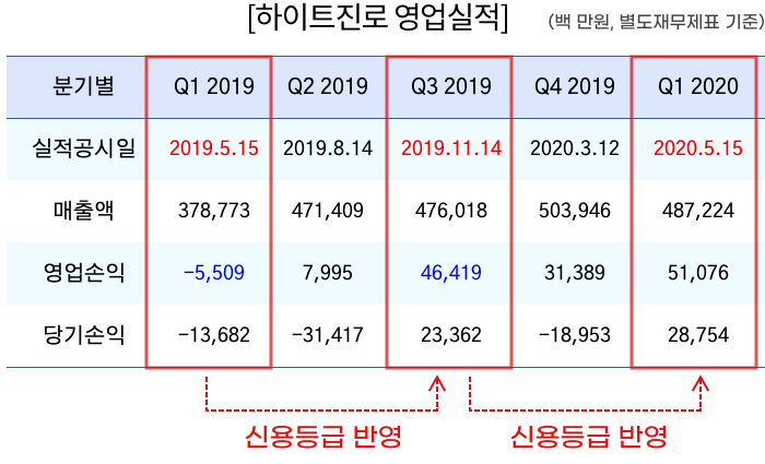 2019.7월 말~9월 말까지 하이트진로의 매출액과 영업이익은 큰 폭으로 증가(Earning Surprise)하였고(2019.11.14 공시), 2020년 1분기(2020.5.15 공시)에는 분기 영업이익 500억 원을 초과 달성했습니다. 회사의 사정이 2019. 7부터 개선되어 2019.11에 실적 개선을 확인할 수 있었음에도 불구하고 신용평가등급은 2020. 5.29이 되어서야 A-(안정적)으로 조정되었습니다.