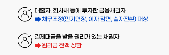대출자(은행 등), 회사채(CP, 전단채 등 포함) 투자자 등 금융채권자는 채무조정(만기연장, 이자감면, 출자전환) 대상이 됩니다. 즉, 채무조정 대상자가 된다면 원리금 100%를 돌려받지 못할 수도 있습니다. 그러나 해당 기업에 물건 등을 납품하고 결제대금을 받을 권리가 있는 채권자(진성어음 보유자)는 원리금을 전액 상환 받습니다.