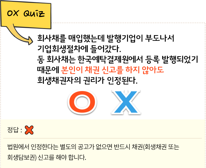 투자자는 발행시장 또는 유통시장에서 회사채를 매입했기 때문에 자동으로 권리가 있는 것으로 생각하기 쉽지만, 본인이 채권자라고 신고하지 않으면 채권 자체가 실효(권리가 없어짐)될 수 있습니다.