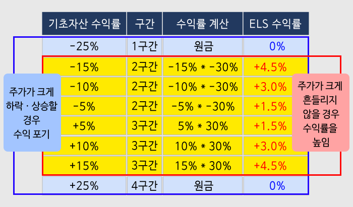 위 그림으로 예시한 원금보장 양방향 KO ELS 상품의 수익 구조를 간단히 정리하면 다음 표와 같습니다.