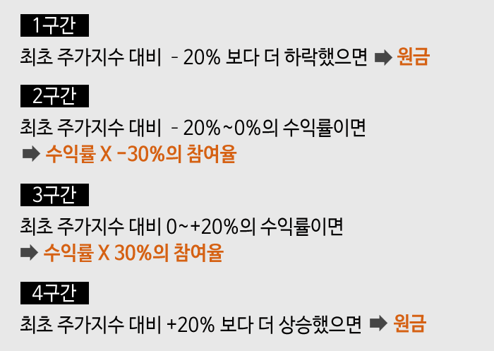 위 상품의 경우는 주가 하락시점의 참여율이 –30%, 주가 상승시점의 참여율이 +30%로 수익의 기울기가 동일했지만, 상품에 따라서는 두 수익참여율이 서로 다르게 설정될 수도 있습니다.