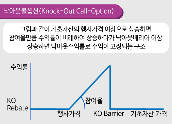 일반적인 ELS로는 이런 니즈를 충족시킬 수 있는 수익구조를 만들기가 참 어렵습니다. 그래서 낙아웃콜옵션과 낙아웃풋옵션을 합성하여 수익구조를 만드는 복잡한 과정을 거쳐야 합니다.