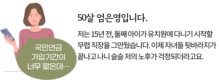저는 15년 전, 둘째 아이가 유치원에 다니기 시작할 무렵 직장을 그만뒀습니다. 이제 자녀들 뒷바라지가 끝나고 나니 슬슬 저희 노후가 걱정되더라고요.