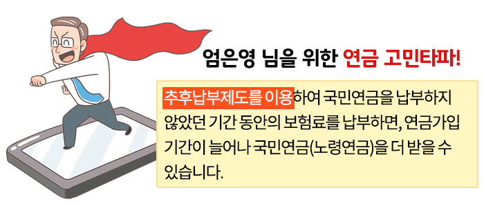 엄은영 님께 추천하는 국민연금 추후납부제도도 연금을 더 받을 수 있도록 하는 방법 중 하나입니다. 추후납부제도는 적용제외나 납부제외 기간 동안 납부하지 않은 보험료를 나중에 납부하면 국민연금 가입 기간으로 인정해 주는 것입니다.