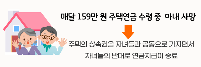 서울에 살던 80대 부부는 공동명의로 된 주택을 담보로 맡기고 매달 159만 원의 주택연금을 수령하고 있었습니다. 그러던 중 아내가 먼저 사망했습니다. 남편은 계속해서 연금을 수령하고 싶었지만, 아내의 사망으로 법에서 정한 상속순위에 따라 직계비속이 주택에 대한 상속권을 가지게 됐습니다. 이후 자녀 7명이 주택연금의 지속을 반대해서 연금지급이 종료됐습니다.