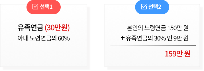 남편이 유족연금 30만 원을 받거나, 아니면 본인 노령연금 150만 원에 유족연금의 30%인 9만 원을 더한 159만 원을 선택해야 합니다. 당연히 유족연금을 포기하고 노령연금 159만 원을 받는 것이 좋습니다.