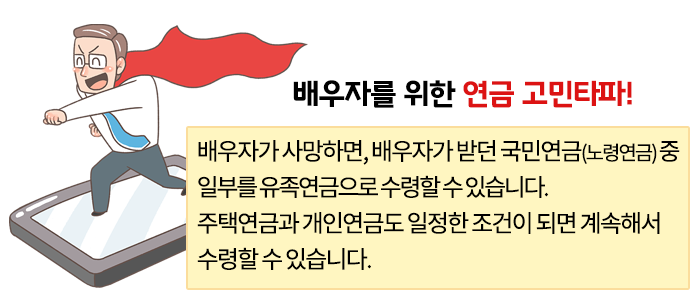 남편이 받던 노령연금의 60%에 해당하는 90만 원이 유족연금으로 나옵니다. 아내는 유족연금 90만 원을 받던가, 아니면 유족연금을 포기하고 본인 노령연금 50만 원에 유족연금의 30%에 해당하는 27만 원을 더해 77만 원을 받을 수 있습니다. 당연히 유족연금 90만 원을 선택하는 게 좋겠죠.