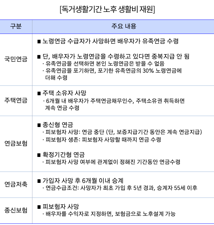 따라서 노후준비를 할 때 배우자 없이 혼자 살아가야 하는 ‘독거생활 기간’에 대한 점검도 빠뜨리지 말아야 합니다.