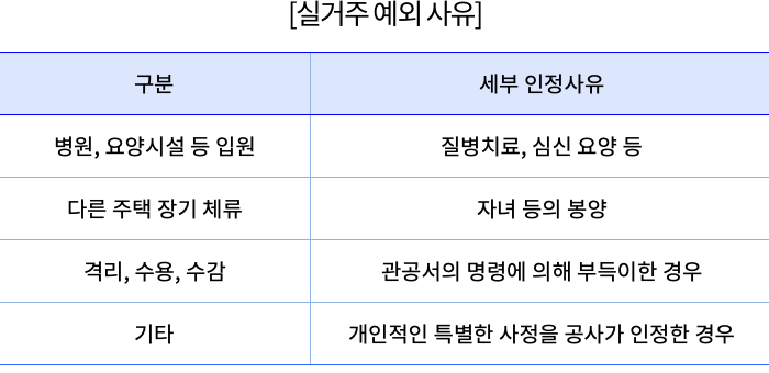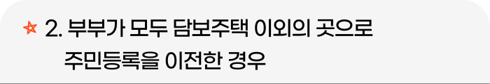부부 모두가 담보주택 이외의 다른 곳으로 주민등록을 이전한 경우에도 지급이 정지됩니다. 다만 주민등록을 이전한 주택을 담보주택으로 변경하면 계속해서 연금을 수령할 수 있습니다. 이 밖에 주택금융공사에서 실거주 예외 사유를 인정받으면 계속해서 월 지급금을 수령할 수 있습니다.