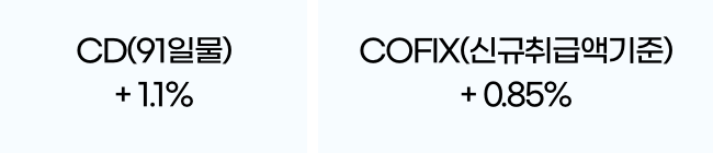 전자는 3개월 변동금리, 후자는 6개월 변동금리입니다. 가산금리는 CD의 경우 1.1%, COFIX의 경우 0.85%가 적용됩니다.