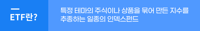 ETF란 특정한 테마의 주식이나 상품을 묶어서 만든 지수를 추종하는 일종의 인덱스펀드라고 할 수 있습니다. 일반 인덱스펀드와 다른 점은 거래소에 상장돼 주식처럼 거래된다는 점입니다.