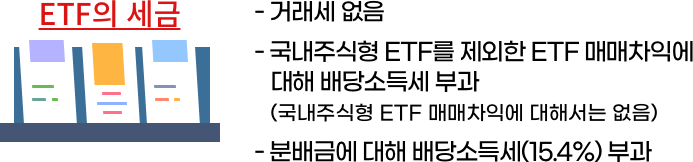 ETF는 주식처럼 매매할 수 있지만, 거래세는 내지 않습니다. 국내주식형 ETF에서 발생하는 매매차익에는 세금을 부과하지 않지만, 국내주식형을 제외한 나머지 ETF에서 발생한 매매차익에는 배당소득세가 부과됩니다.