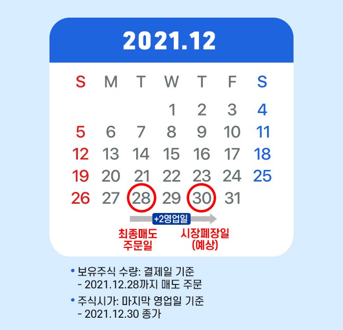 매도주문이 체결되고 결제되기까지 2영업일이 걸린다는 것을 고려하면 주식시장이 폐장하기 2일 전에는 매도하여야 합니다.