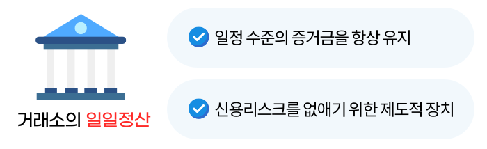 거래소는 거래 상대방 모두에게 증거금을 받고, 매일 장 마감 후 증거금 관리에 들어갑니다. 이를일일정산(Daily Marking to Market)이라 하며, 계약불이행 가능성을 사전에 차단하기 위함입니다.