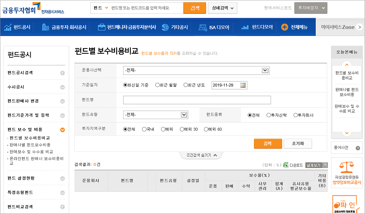 이곳을 통해서 우리나라의 모든 펀드의 보수 및 비용에 대해 검색, 비교를 해보실 수 있습니다.