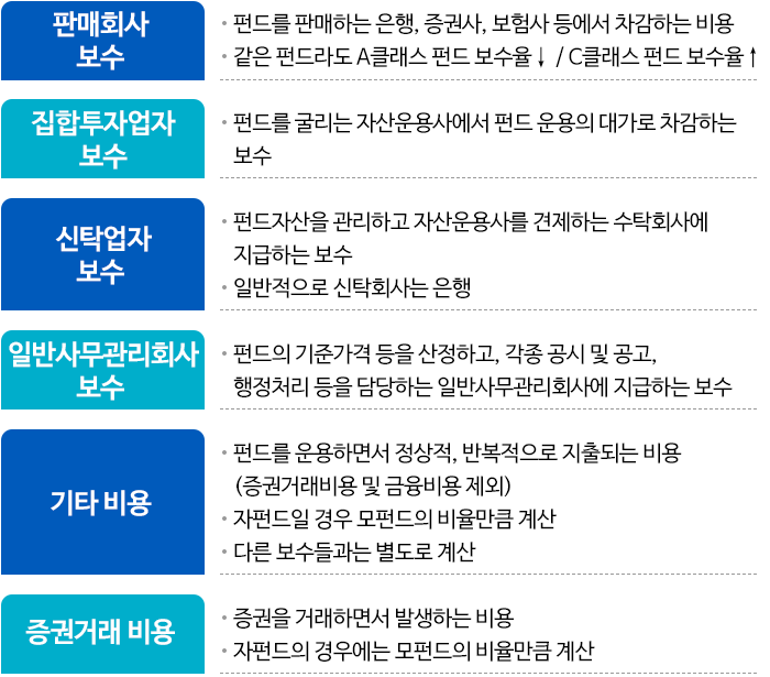 수수료는 일회성 비용으로 딱 한 번만 발생하는 비용입니다. 펀드 가입 시에 발생하는 ‘선취수수료’와 펀드 환매 시에 발생하는 ‘후취수수료’가 있습니다.