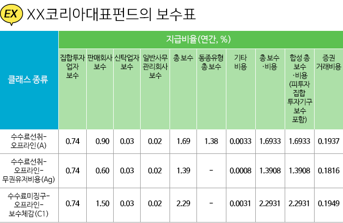 위의 예시를 보면, XX코리아대표펀드 A클래스의 총보수는 1.69%로 동종유형 총보수율 1.38%보다 약간 높은 편이라는 것을 알 수 있습니다.