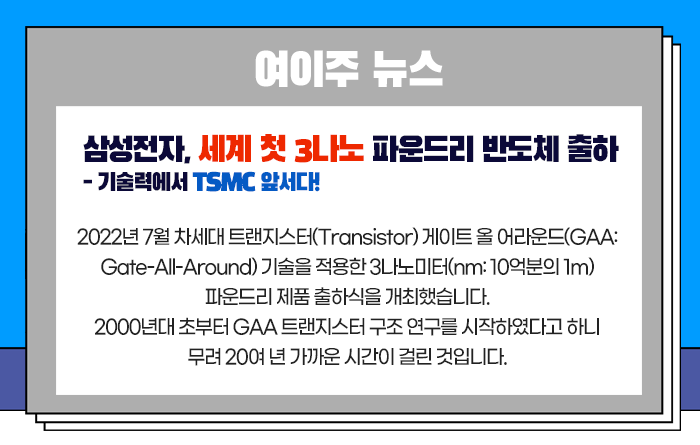이에 반도체 업체는 첨단 공정기술을 지속적으로 개발하고 미래 반도체 기술 확보를 위한 노력을 지속하고 있는 것입니다. 다음은 업계 최초로 '게이트 올 어라운드'(Gate-All-Around) 구조의 3나노미터 초미세 공정 양산에 돌입한 삼성전자의 뉴스입니다.