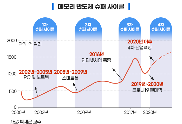 스마트폰 보급이 대중화되었던 2010년대 초반, 인터넷사업이 폭증했던 2010년대 중반, 코로나19 팬데믹이었던 2020년대 초반 등이 대표적인 반도체 슈퍼 사이클 기간에 해당합니다.