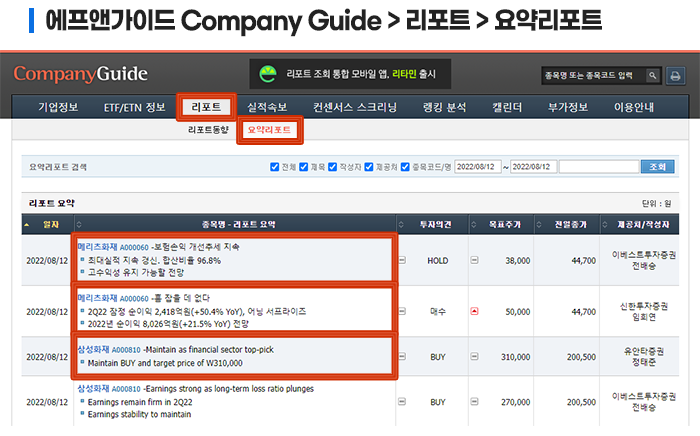 이외에도 에프앤가이드의 컴퍼니 가이드(Company Guide)에 들어가시면 리포트의 제목과 두 줄로 요약된 정보를 확인할 수 있는 곳도 있습니다.