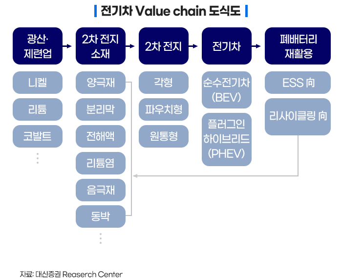 가장 후방 산업인 광산·제련업, 양극재·음극재 등을 만드는 2차 전지 소재 산업, 소재를 활용해 리튬이온 전지를 만드는 2차 전지 산업, 2차 전지를 활용해 완성차를 만드는 전기차 제조업, 수명이 끝난 2차 전지에서 희귀 금속을 추출하는 폐배터리 재활용 산업 등이 있습니다.