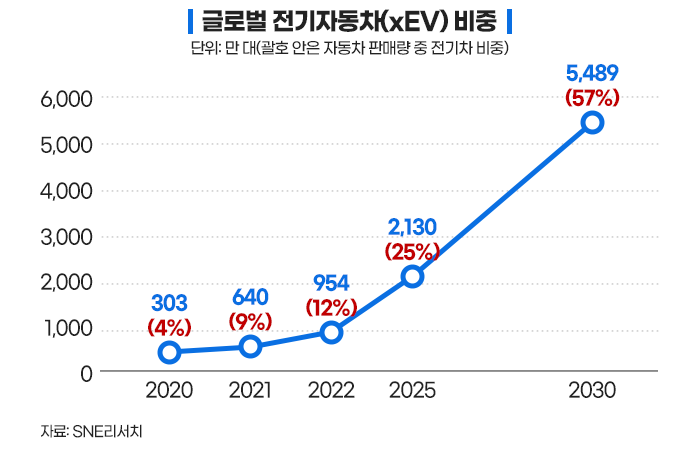 이 수치는 테슬라, 폭스바겐, 비야디, 현대차그룹 등 20개 주요 완성차 제조사의 2030년 평균 전기차 판매 비중 목표치 56%와 유사합니다.