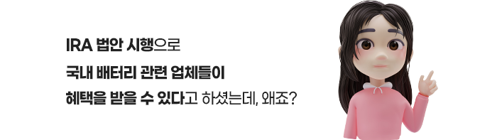 IRA 법안은 전기차 보급 확대를 위해 전기차 구매 시 세액 공제를 해주는 내용이 포함되어 있는데요. 미국이 자국 제조업을 활성화해 중국에 대한 의존도를 줄이겠다는 것이 목표입니다.