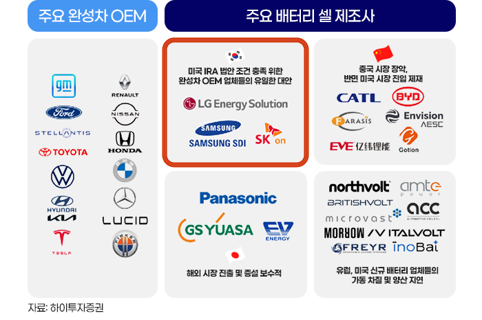 그래서, 핵심 부품 중 하나인 배터리와 관련해 까다로운 조건을 충족해야 하는데, 전 세계 완성차 제조사들이 미국 시장 진출 시 선택할 수 있는 대안으로 국내 3사가 가장 유리한 상황이라고 합니다.