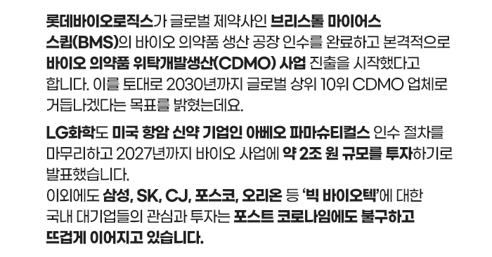 앞으로도 고성장이 기대되는 제약·바이오 산업에서 부가가치가 높은 연구개발, 제조생산(CMO, CDMO) 역량 등 글로벌 경쟁력을 가진 기업이 국내에서도 탄생하기를 응원합니다!