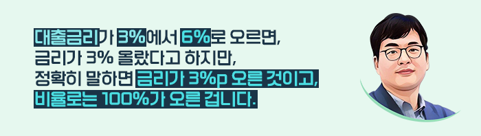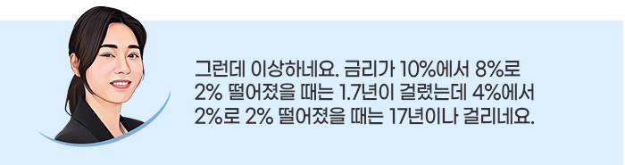 둘 다 금리가 2% 떨어졌지만, 실제로는 2%p 떨어진 겁니다. 10%에서 8%로 떨어진 것은 20% 떨어진 것이고, 4%에서 2%로 떨어진 것은 50%가 떨어진 겁니다. 그래서 내 돈을 2배로 만드는 데 걸리는 시간도 그만큼 차이가 나는 겁니다.