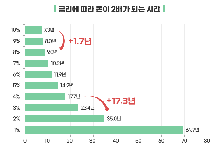 또, 금리가 4%라고 가정해 보면 17.7년, 금리가 2%일 때는 35년이 걸립니다. 금리가 4%에서 2%로 떨어졌을 때 내 돈이 두 배가 되는데 17.3년이 더 걸리는 것이죠.