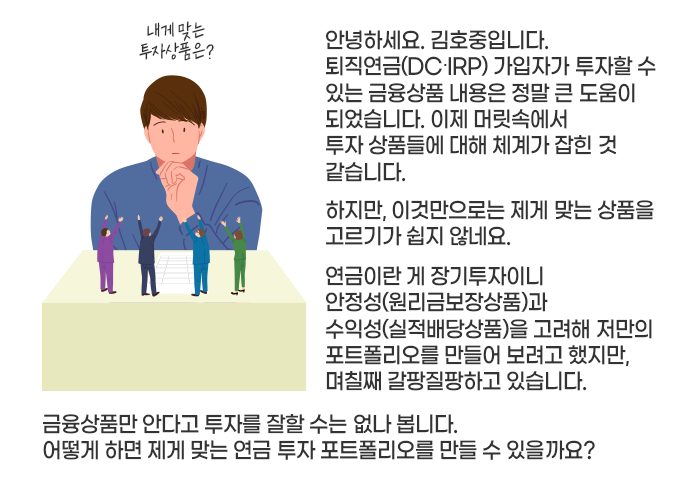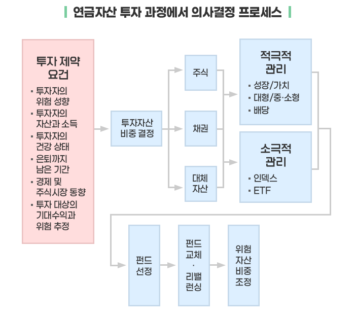 이해를 돕기 위해 복잡한 연금자산 투자 과정에서의 의사결정 프로세스를 아래의 그림으로 정리하였으니 확인해 보시기 바랍니다.