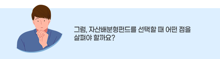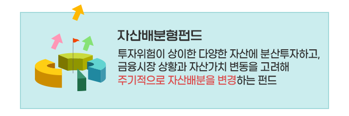 자산배분형펀드란 투자위험이 상이한 다양한 자산에 분산투자하고, 금융시장 상황과 자산가치 변동을 고려해 주기적으로 자산배분을 변경하는 펀드를 말합니다.