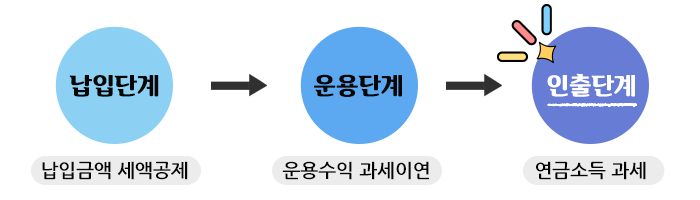 IRP계좌에서 연금으로 수령할 경우 각 단계에서 다양한 절세혜택을 지원하고 있습니다. 납입단계에서는 납입금액의 세액공제, 운용단계에서는 운용수익의 과세를 인출단계까지 이연시켜주며, 마지막 인출단계에서는 연금으로 수령 시 상대적으로 낮은 소득세를 적용시켜줍니다.