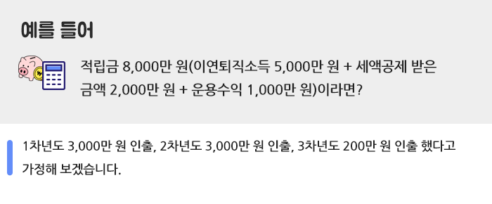 세액공제를 받지 않은 금액이 가장 먼저 차감되고, 이연퇴직소득, 세액공제 받은 금액 및 운용수익 순으로 차감되면서 세금이 계산됩니다.