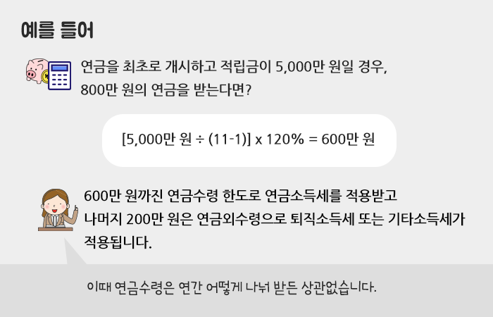 ‘연금수령’은 연금소득세를 적용하는 금액의 한도로, 연금 계좌 잔고를 11-수령연차로 나눈 뒤 120%를 곱한 금액입니다. 만약 이 금액을 넘는다면 ‘연금외수령’으로 분류됩니다.