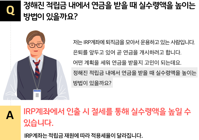 즉, IRP계좌의 세금은 가장 마지막 인출단계에서 발생하기 때문에 인출단계에서 절세를 통해 실수령액을 높일 수 있습니다.