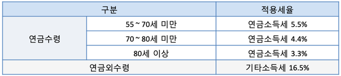 연금소득세는 그 재원이 이연퇴직소득일 경우 퇴직소득세의 60~70%가(퇴직소득세의 30~40% 절감) , 세액공제 받은 금액이나 운용수익일 경우 연령에 따라 3.3~5.5%가 부과됩니다.