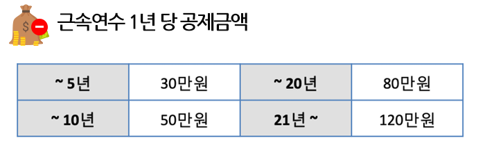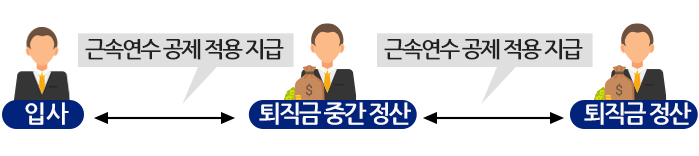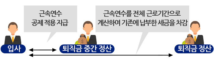 ‘근속연수 공제’ 금액은 근속기간이 길수록 커지고, 중간에 퇴직금을 정산한 경우에는 퇴직금을 정산 받은 시기부터 다시 근속연수를 계산하므로 근속연수가 짧아져 공제금액이 상대적으로 적어지게 됩니다.
