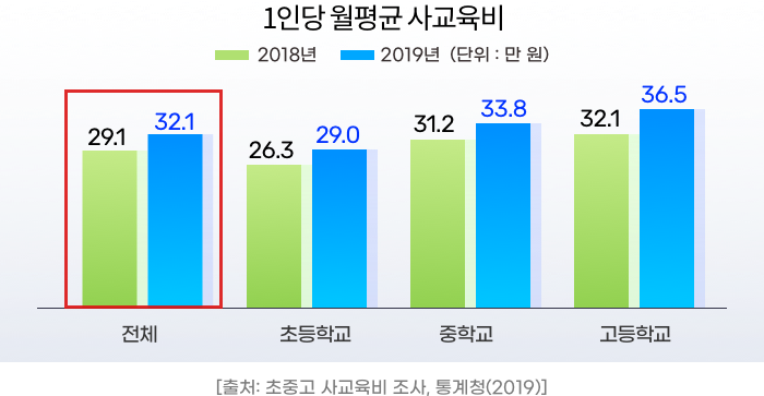 2019년 통계청 자료에 따르면 초중고 사교육비 평균은 월 32만 원 수준인 것으로 나타났습니다. 연간으로 치면 384만 원 정도 되는 셈입니다.