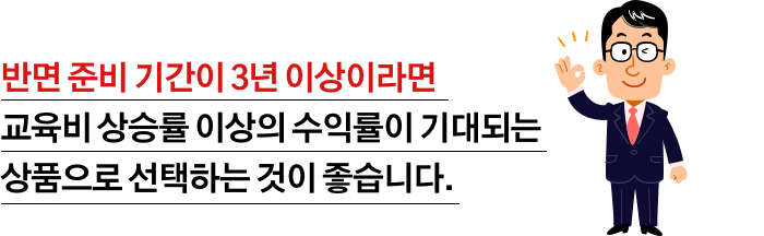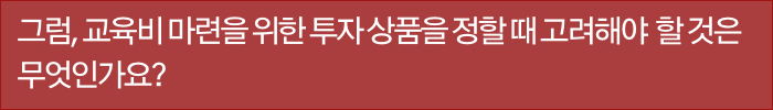 교육비 마련을 위한 투자 상품을 정할 때는 내가 얼마만큼의 준비 기간을 둘 것인가를 기준으로 생각해야 합니다.
