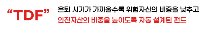 TDF란 은퇴 시기를 목표시점(Target Date)으로 삼아 은퇴 시기가 가까울수록 위험자산인 주식의 비중을 낮추고 안전자산인 채권의 비중을 높이도록 자동으로 설계된 펀드를 말합니다.