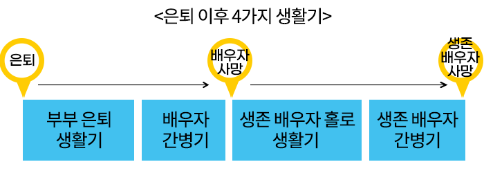 노후생활은 은퇴 이후 부부가 같이 생활하는 기간, 배우자 간병기, 배우자 사망 후 홀로 남아 생활하는 기간, 생존 배우자 간병기로 나눌 수 있습니다.