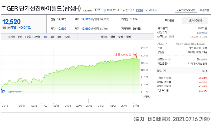 현재 우리나라에서 유일한 하이일드ETF인 TIGER단기선진하이일드(합성H) ETF(코드: 182490)는 KOSPI시장에 상장되어 언제든지 주식처럼 사고팔 수 있는 장점이 있습니다.