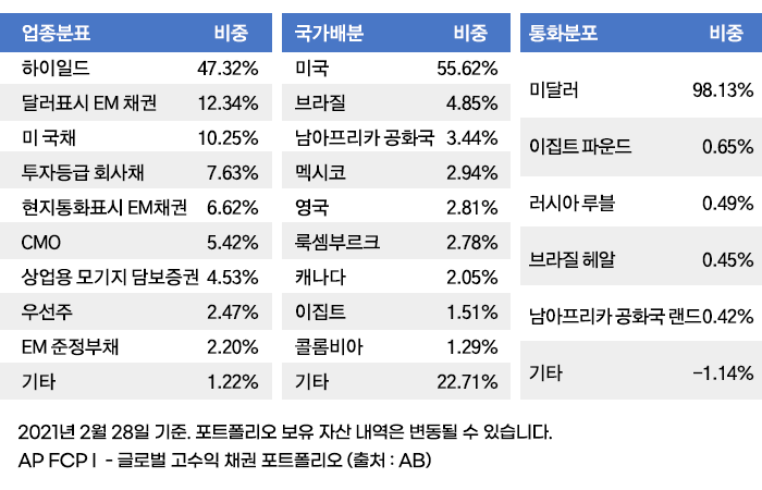 대표적인 글로벌하이일드채권형펀드인 AB글로벌고수익펀드의 경우 무려 70여 개국의 2,400여 개의 채권에 분산투자하고 있습니다.