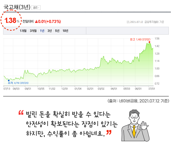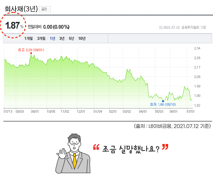 몇 번 밥을 얻어먹을 생각으로 친구 B에게 돈을 빌려주기로 결정했는데 친구B가 밥 한 번에 커피 한 잔이면 충분하지 않냐고 하는 것처럼, 조금 높은 이자를 얻기 위해 안정적인 국채를 포기하고 조금의 위험성을 가진 회사채 투자를 선택했는데 이자에 큰 차이는 없어 아쉽네요.