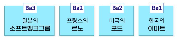 일본의 소프트뱅크그룹도 무디스 기준으로 Ba3로 투자주의등급에 속하고 있고 세계적인 자동차메이커인 프랑스의 르노, 미국의 포드도 무디스 기준으로 Ba2로 투자주의등급에 속하고 있죠. 한국의 이마트도 무디스 기준으로는 얼마 전 Ba1 등급을 받은 바 있습니다.