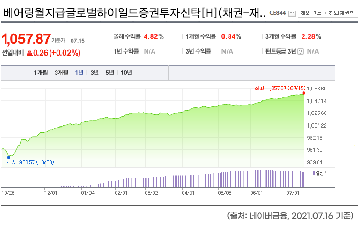 두번째로 많은 규모의 자금(930억원)을 운용하고 있는 베어링월지급글로벌하이일드펀드는 비교적 최근인 2020.10.23 에 설정되었으며 환헤지를 하기 때문에 달러의 변동성을 제거할 수 있다는 장점이 있으며, 매월 수익금을 지급하는 월지급식으로 가입할 수 있어 은퇴자들이 선호하는 펀드입니다.