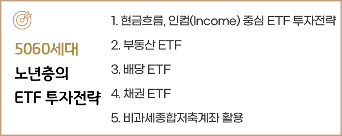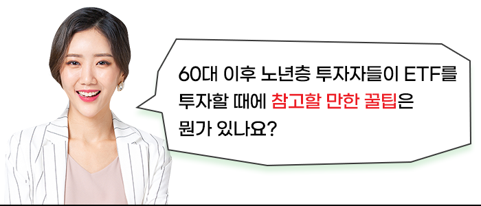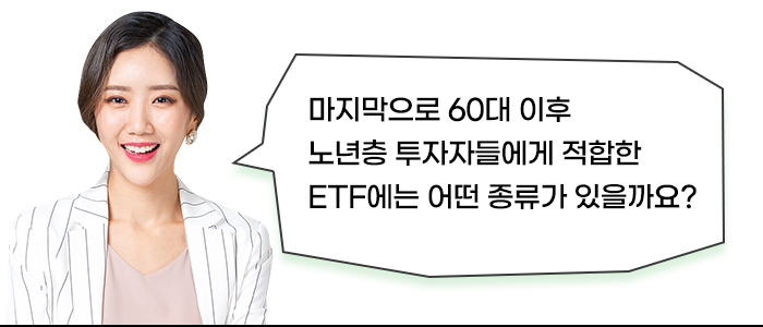 60대 이상의 노년층은 안정적이면서 현금흐름이 확보되는 투자방안을 ETF의 선택에 충분히 반영해야 합니다.