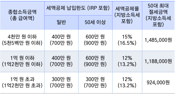 연금저축계좌로는 연 400만 원, IRP계좌를 포함하면 최대 연 700만 원까지 세액공제를 받을 수 있습니다.